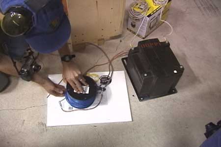 Fellow coiler checking for heat buildup in current limiting ballast.